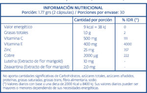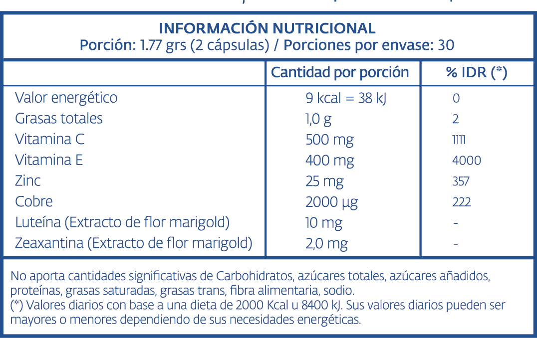 Vitamina C, Vitamina E, gelatina, aceite de soja, agua, óxido de zinc, luteína, sulfato de cobre monohidrato, zeaxantina, AGC: INS 422, INS 901, EMU: INS 322, COL: dióxido de titanio, rojo 33. CONTIENE DERIVADOS DE SOJA. BAJO CONTENIDO DE SODIO.